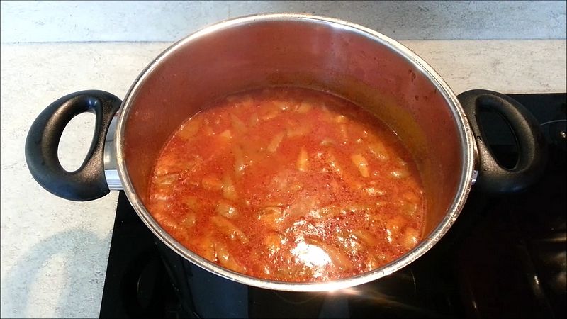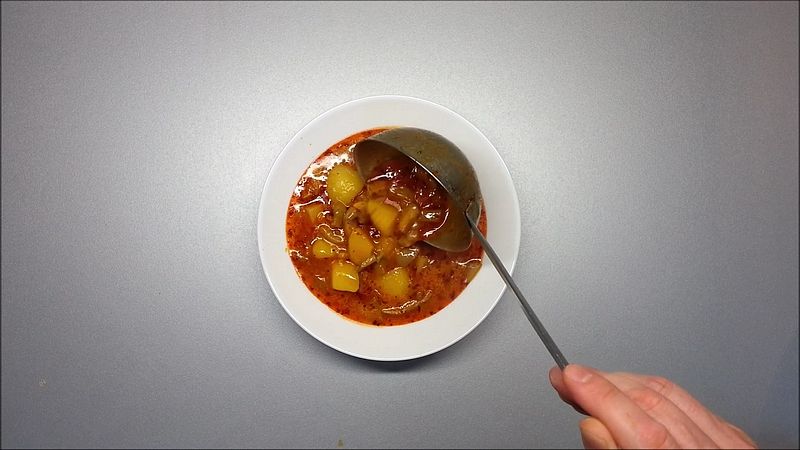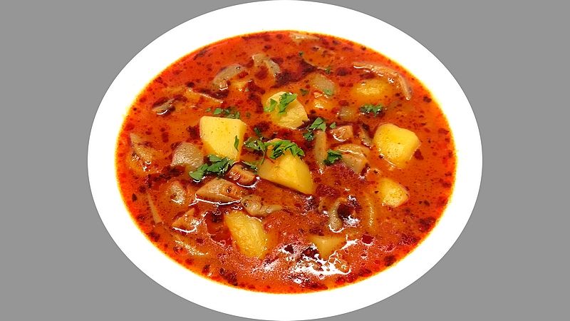 Cibuli osmažíme na oleji. Ke konci přidáme 2 lžíce sladké mleté papriky a 1 lžíci hladké mouky a ještě pár vteřin osmažíme. Poté vše zalijeme studenou vodou, přidáme nakrájený česnek, 1/2 lžičky kmínu, 4 kuličky nového koření, 1 bobkový list, 1 bujon, pepř, nakrájené brambory a hlívu ústřičnou a vaříme doměkka.