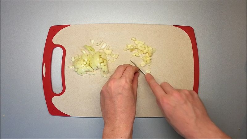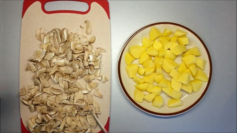 Jednu cibuli, tři stroužky česneku, brambory a hlívu nakrájíme.