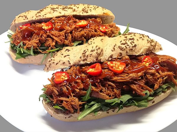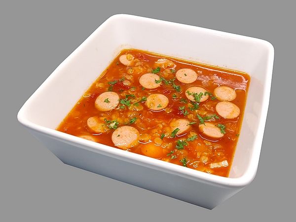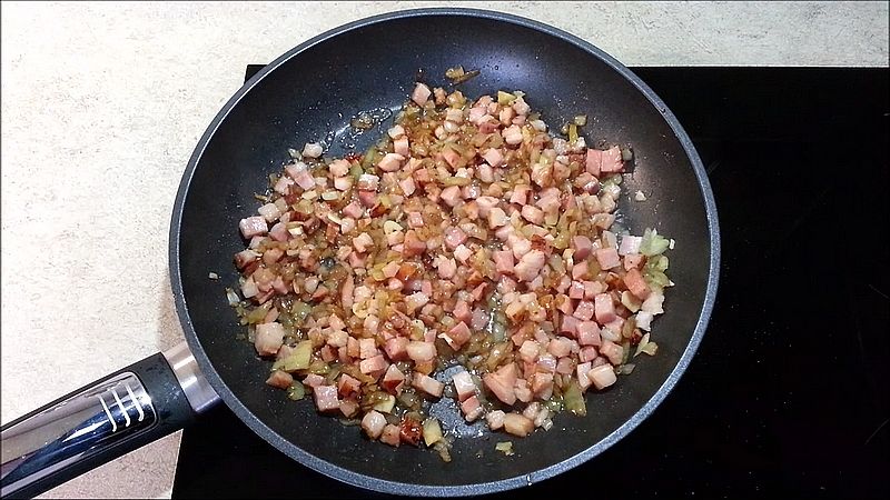 Pak přidáme 3 nakrájené stroužky česneku na plátky a 200 g anglické slaniny nakrájené na kostičky, 1/2 lžičky drceného kmínu, mletý pepř, 1 lžíci sójové omáčky a vše ještě 5 minut pozvolna smažíme.