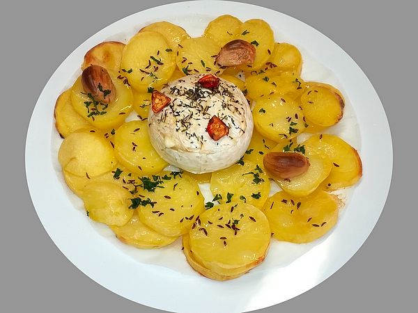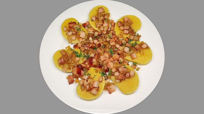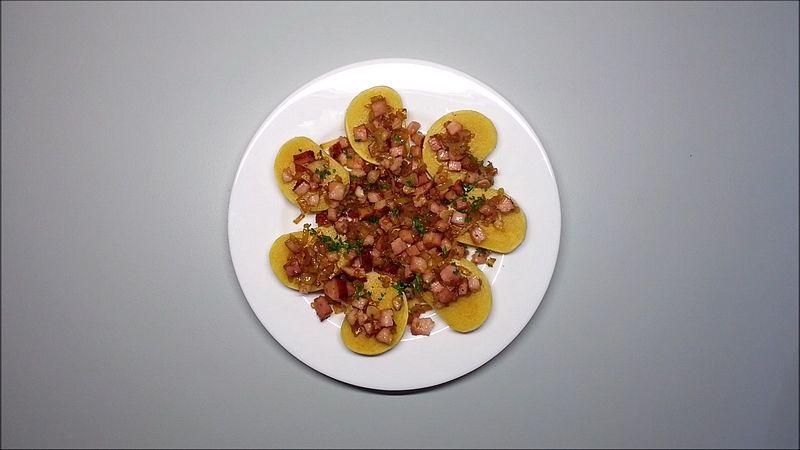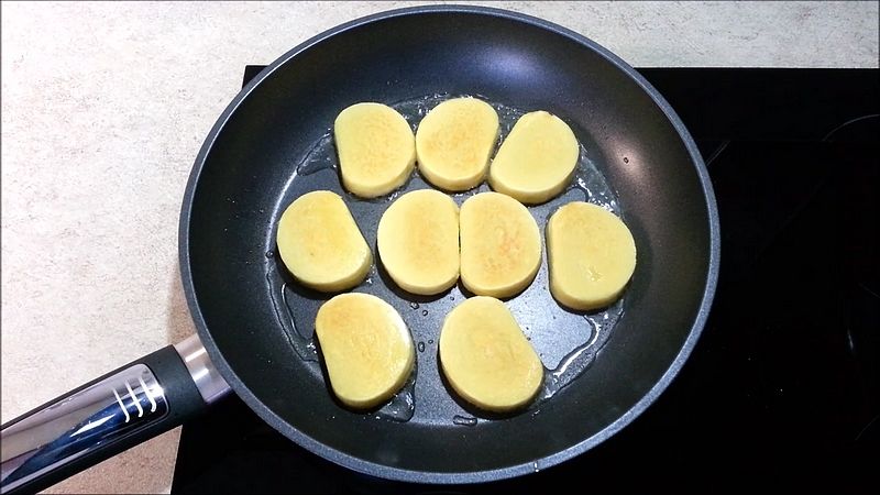 Nakrájený bramborový knedlík na plátky osmažíme na oleji na pánvi.