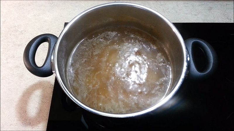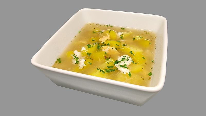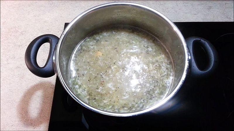 Do hrnce dáme 500 g oškrábaných nakrájených brambor. Přilijeme 1,6 l vývaru (nebo vody a přidáme bujón), přidáme 1/2 lžičky celého komínu, mletý pepř a polévku přivedeme k varu. Vaříme od bodu varu 10 minut.