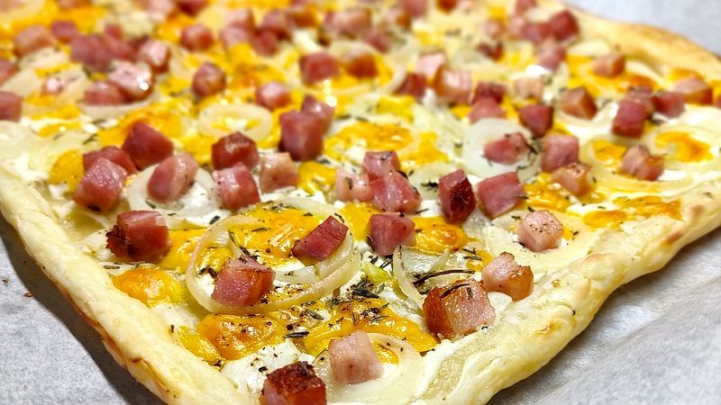 Poté přidáme nakrájený čedar, anglickou slaninu a cibuli. Všechny suroviny trochu osolíme, opepříme a posypeme sušeným tymiánem.