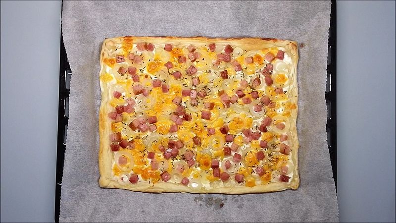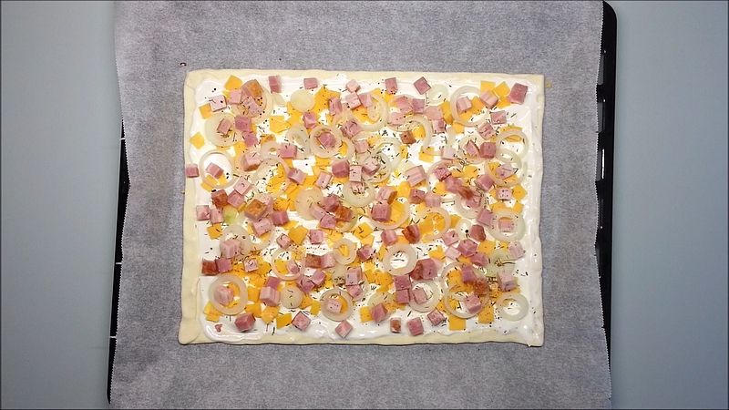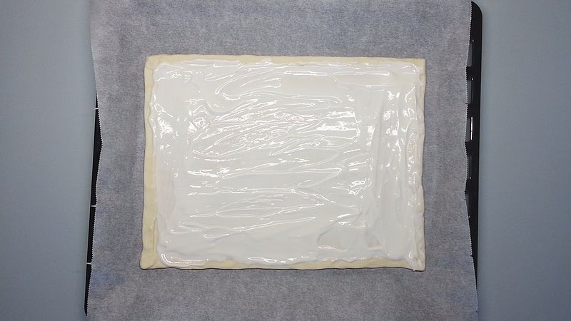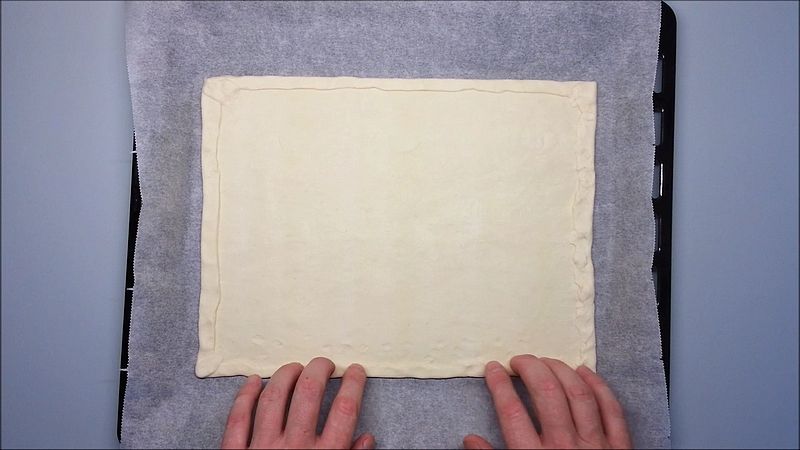 Listové těsto dáme na pečící papír, přehneme a přimáčkneme okraje cca 1 cm.