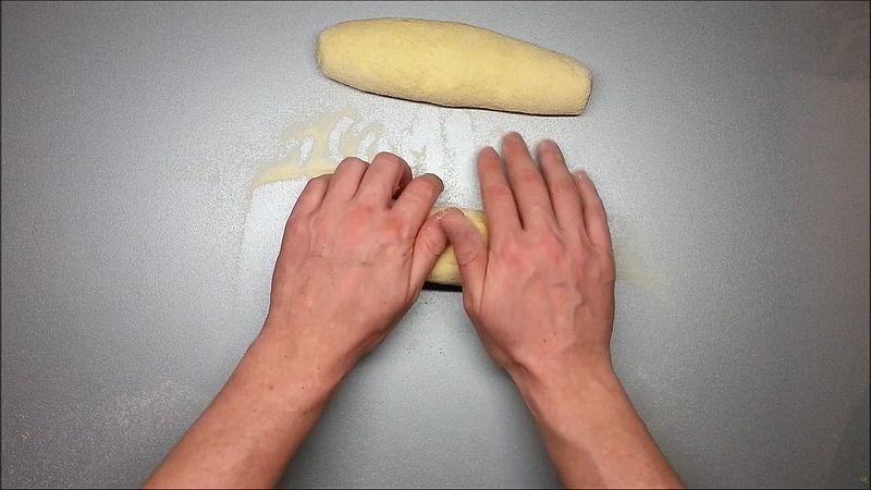 Na pomoučeném vále těsto rozdělíme na dva díly a vyválíme šišky. Knedlíky mají mít v průměru okolo 5 cm. Pokud je těsto příliš řídké tak přidáme ještě trochu mouky. Záleží na konzistenci koupených brambor.