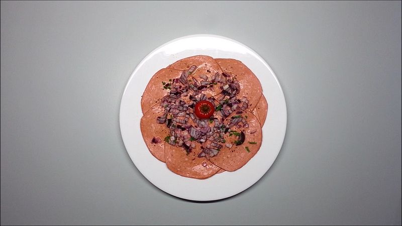 Na talíř naskládáme kolečka nakrájeného gothaje. Posypeme nakrájenou červenou cibulí. Polijeme směsí vody a octa, podle chuti osolíme a opepříme. Doprostřed přidáme feferonku.
