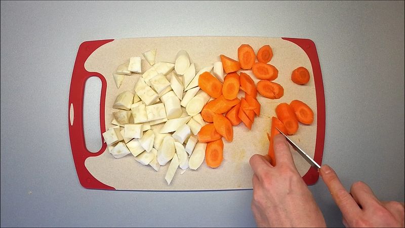 Mezitím si nakrájíme kousek celeru, 3 malé petržele a 3 mrkve. Zeleninu přidáme k vývaru když je maso téměř měkké a vaříme ještě 20 minut společně.