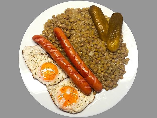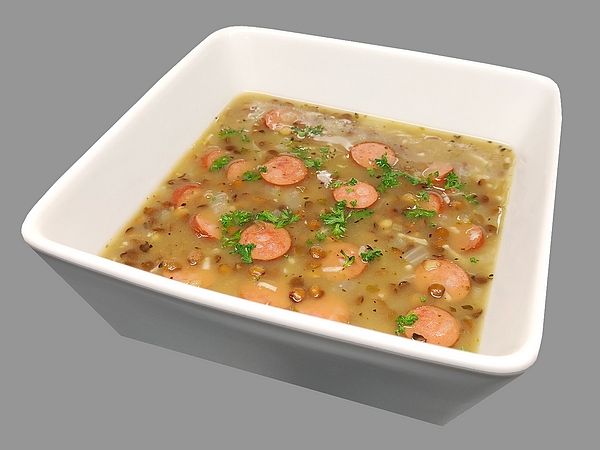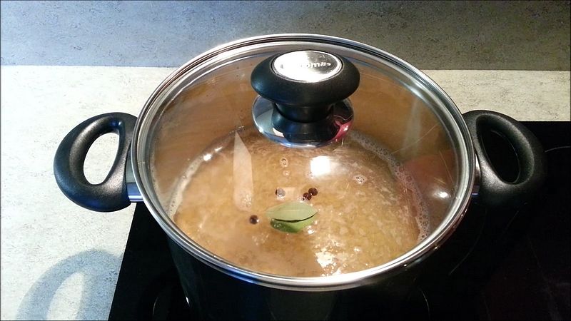 Žlutý hrách namočíme podle návodu na obalu. Poté ho propláchneme, zalijeme čistou vodou, přidáme 2 bobkové listy, 4 kuličky nového koření a dáme vařit. Nesolíme!!!