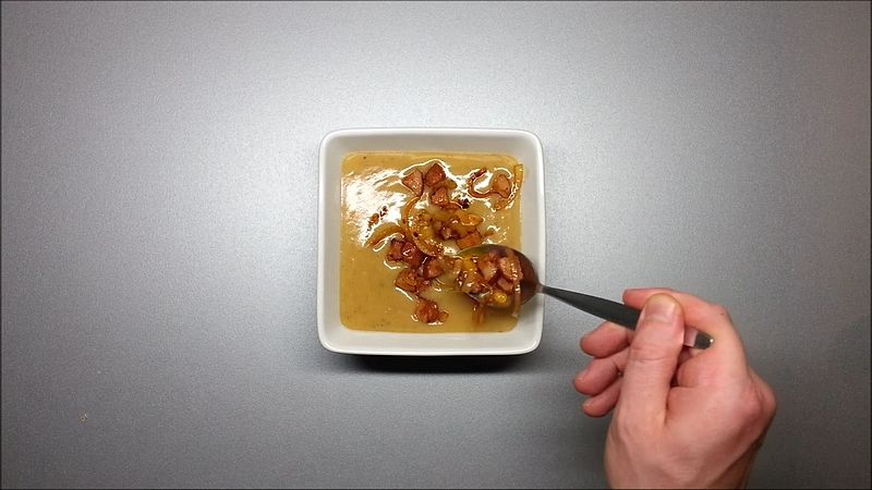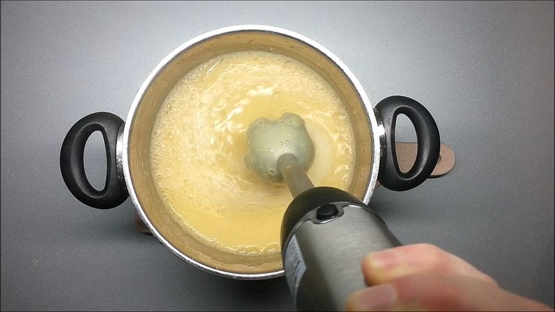 Když je hrách měkký, tak vyndáme koření (bobkový list a nové koření) a směs rozmixujeme ponorným mixérem dohladka. Přivedeme k varu a přidáme lžičku majoránky, bujón nebo sůl, prolisovaný česnek a polévku opepříme, dosolíme a vaříme ještě 5 minut.