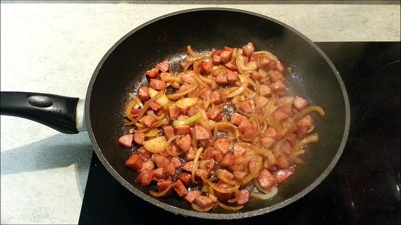 Dvě cibule nakrájíme na měsíčky a klobásu na kostičky. Obojí osmažíme společně na oleji na pánvi. Před koncem můžeme přidat špetku sladké papriky pro barvu. Tu už ale pak nesnažíme dlouho protože by zhořkla.