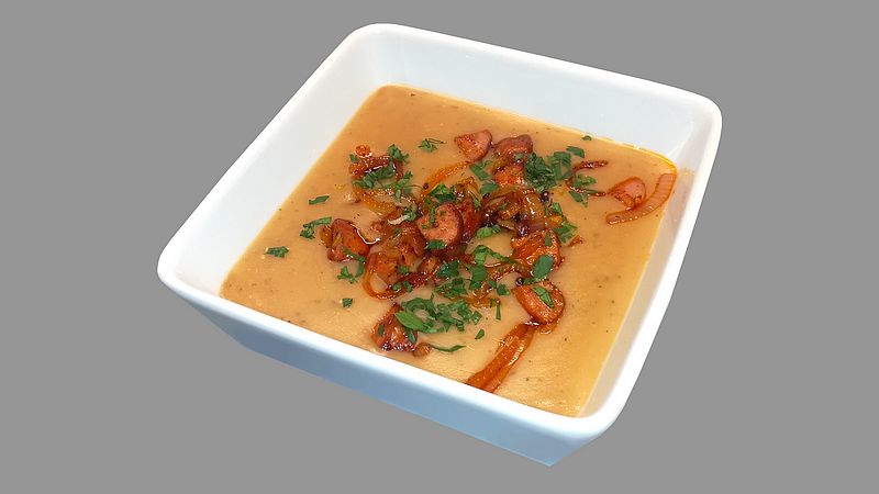 Smaženou klobásu s cibulí dáme navrch a posypeme polévku sekanou petrželkou.