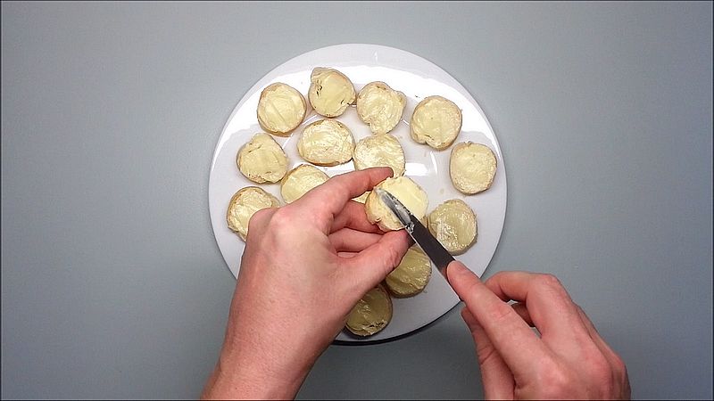 Nakrájené rohlíky na kolečka namažeme máslem.