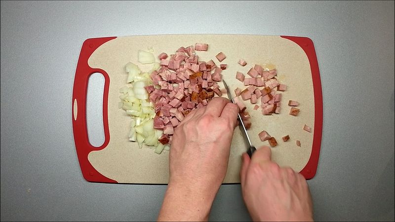 Cibuli nakrájíme najemno a anglickou slaninu na kostičky.
