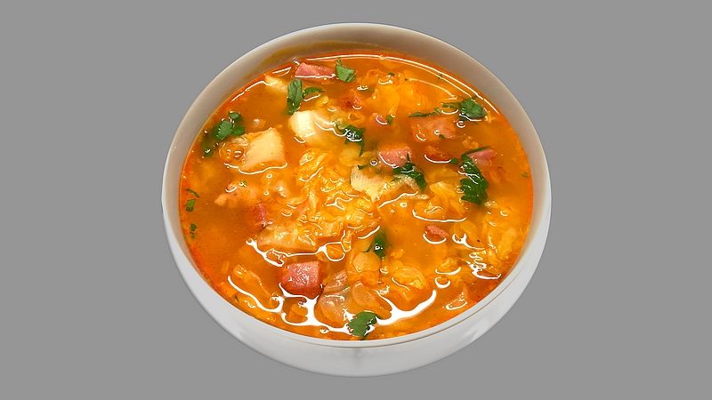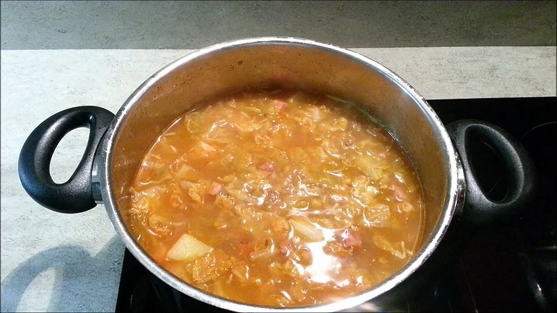 Na oleji osmažíme cibuli, potom přidáme anglickou slaninu a orestujeme ji. Nakonec přidáme 1 lžíci hladké mouky, 1 lžíci mleté sladké papriky, 1/2 lžičky celého kmínu a ještě půl minuty orestujeme. Poté vše zalijeme vývarem (nebo vodou a přidáme bujon), přidáme kapustu, na kostičky nakrájené brambory a vaříme.