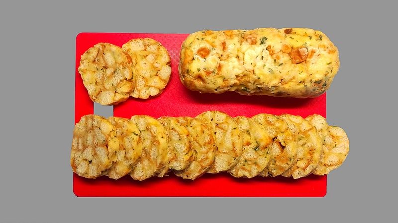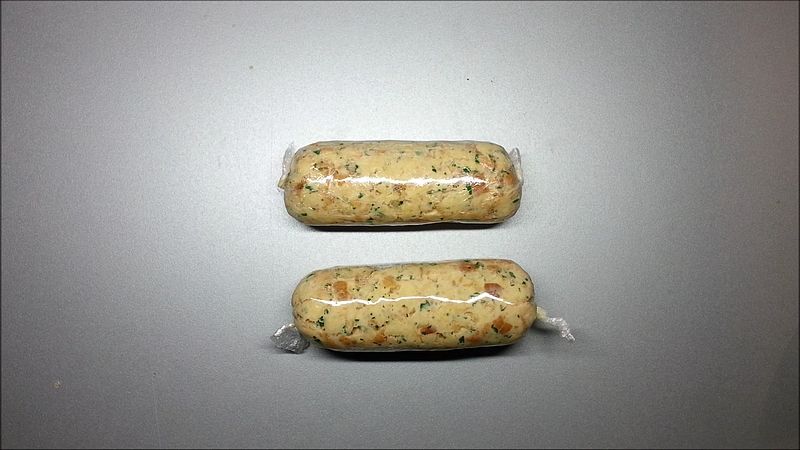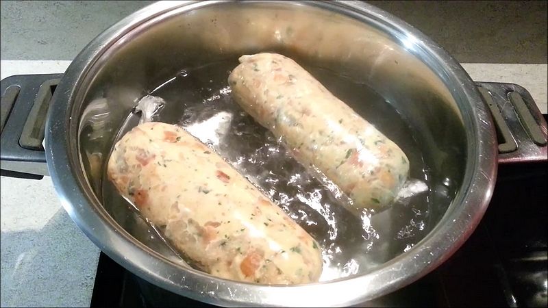 Oddělíme 2 žloutky od bílků a z bílků vyšleháme sníh. K žloutkům přidáme 200 ml mléka, 100 g hrubé mouky a 1 lžičku soli a promícháme. Směs nalijeme na vychladlé nakrájené housky, přidáme hrst pokrájené plocholisté petržele, ještě 100 ml mléka a vyšlehaný sníh. Po promíchání směs rozdělíme na dvě části a plníme do potravinové fólie. Fólii držením za konce a otáčením důkladně utáhneme.