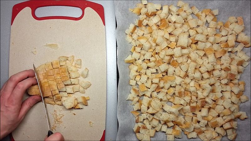 Sedm housek nakrájíme na kostičky a dáme na plechu do předehřáté trouby na 200 stupňů na 10 minut. Poté je necháme vychladnout.