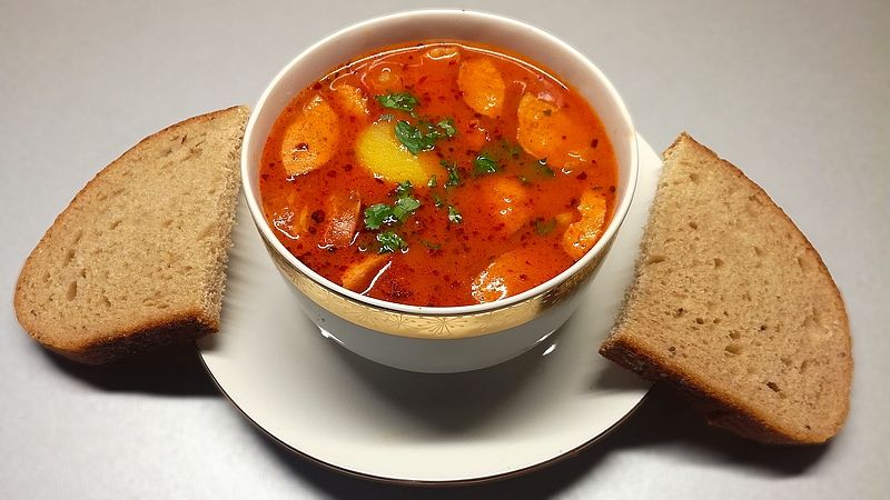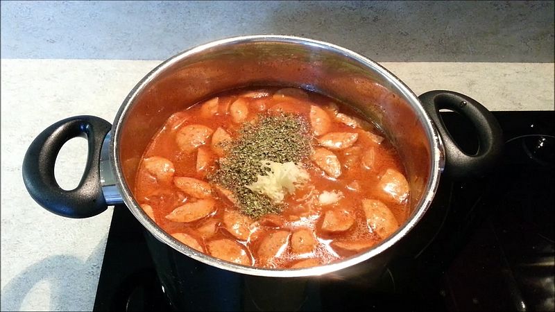 Cibuli necháme na oleji zesklovatět. Poté přidáme špekáčky které orestujeme a nakonec 2 lžíce sladké mleté papriky. Papriku smažíme jen krátce aby nezhořkla. Zalijeme vodou, přidáme brambory a 1/2 lžičky celého kmínu, 1 bobkový list, 4 kuličky nového koření, bujon, pepř a vaříme dokud nejsou brambory téměř měkké.