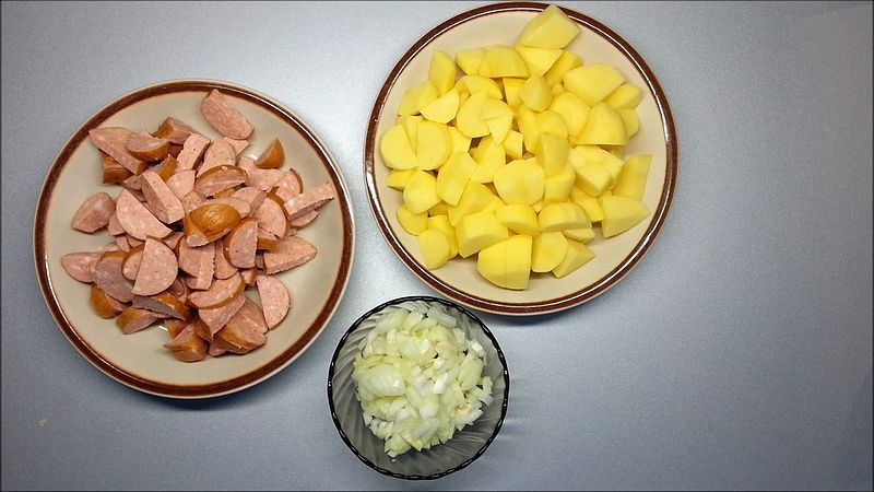2 střední cibule nakrájíme nadrobno, brambory na kostičky a špekáčky na půlkolečka.