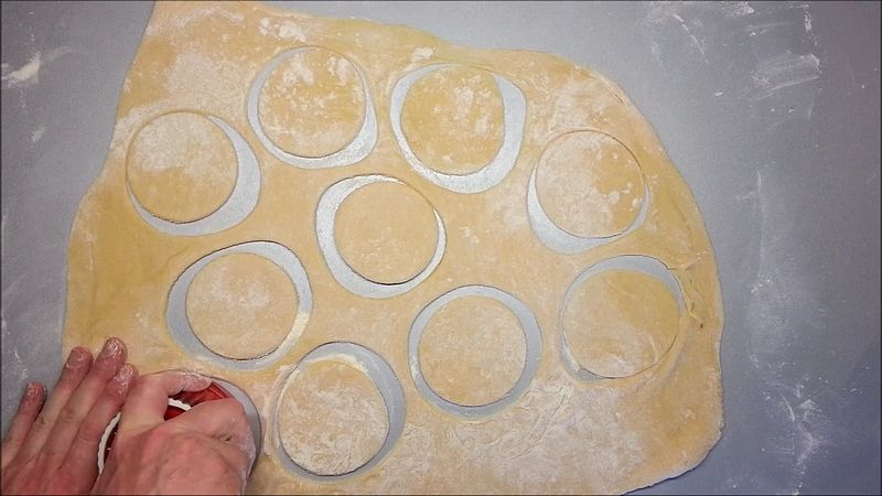 Těsto po vykynutí vyválíme na pomoučeném vále na placku zhruba 3 mm tlustou. Hrnečkem vykrajujeme koláčky které skládáme na pečící papír.