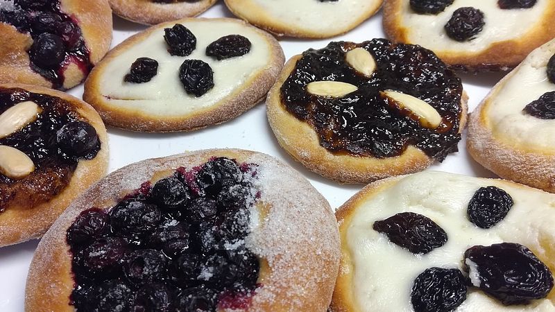 Část koláčků potřeme tvarohovou náplní a přidáme rozinky, část povidly a přidáme mandle, nebo borůvky které posypeme cukrem krystal.