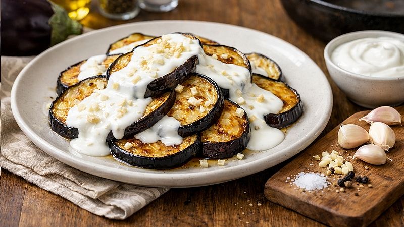 Opečený lilek rozložte na talíř a přelijte jogurtovou směsí. - Podávání