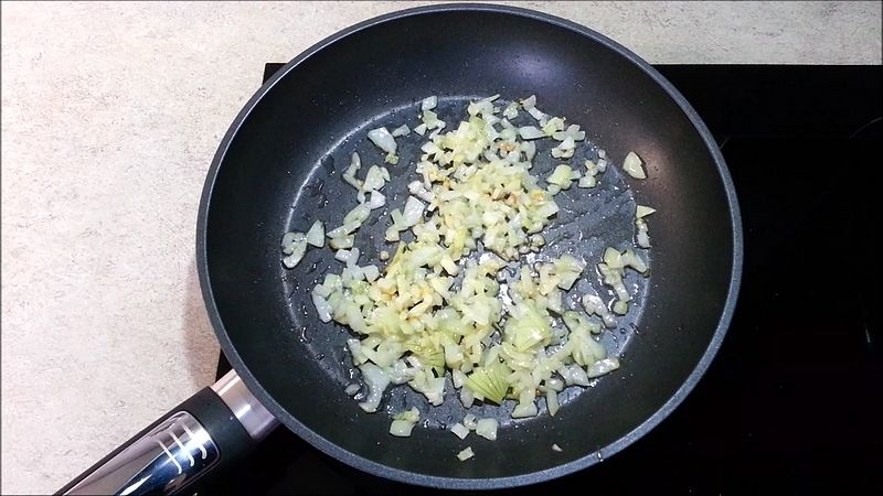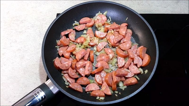 Přidáme dvě nakrájené klobásy na půl kolečka a osmažíme.