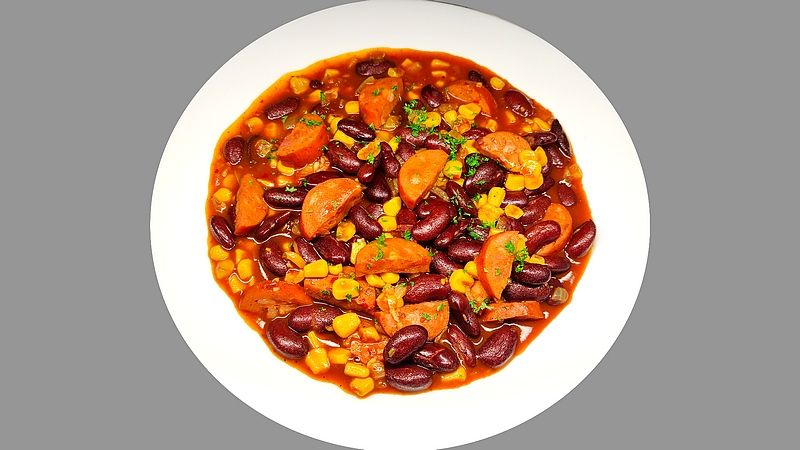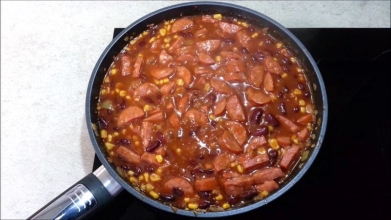 Poté přidáme 1 lžičku sladké mleté papriky, sterilované fazole i se šťávou 2 × 410 g, sterilovanou kukuřici 330 g, mletý pepř, 3 prolisované stroužky česneku, 2 lžíce sójové omáčky, 3 lžičky rajčatového protlaku, 4 lžíce sladké chilli omáčky a vaříme 15 minut. Poté ihned podáváme.