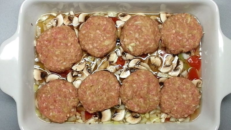 Po promíchání z masa tvarujeme karbanátky. Do pekáčku nalijeme sklenici studené vody, přidáme nakrájenou cibuli a nakrájené rajče, nakrájené žampiony nebo jiné čerstvé houby na plátky, 2 bobkové listy, 4 kuličky jalovce, špetku kmínu a 1 lžičku sójové omáčky. Zelenina by měla být potopená pod vodou a na ní dáme karbanátky.