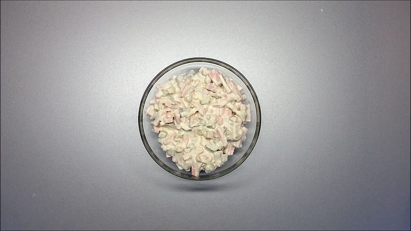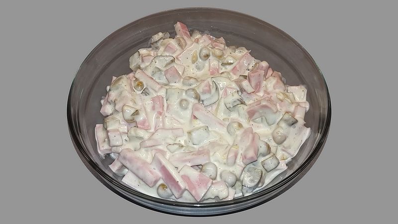 Nadrobno nakrájíme 1 menší cibuli, 4 kyselé okurky na kostičky, 200 gramů měkkého salámu na nudličky, přidáme 3 lžíce sterilovaného hrášku, 180 g majonézy, 1 menší lžičku soli, trochu pepře, 1 lžičku octa, 1/2 lžičky cukru moučka, 1,5 lžičky worcesterské omáčky, 1 lžičku plnotučné hořčice a vše důkladně promícháme.