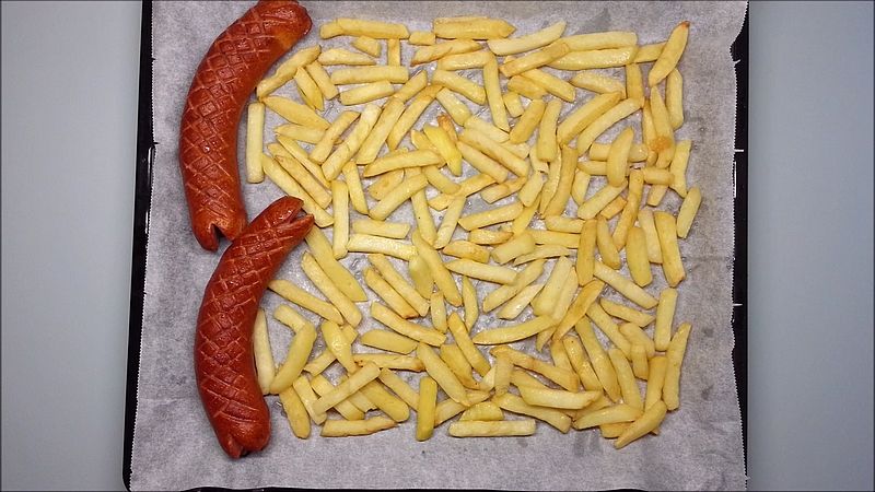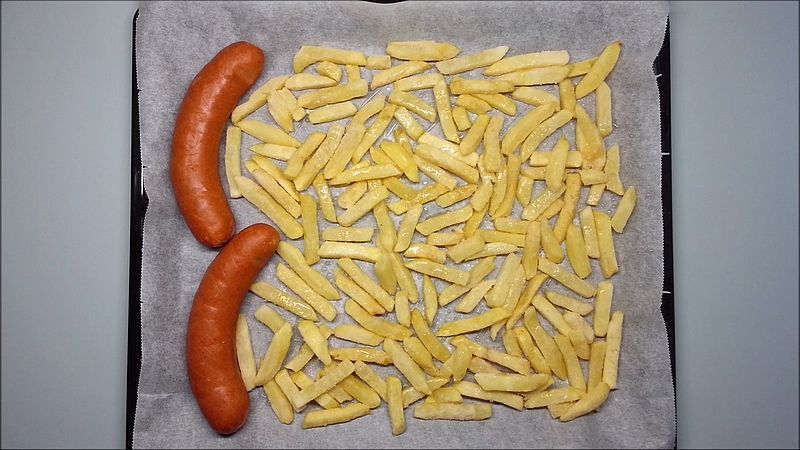 Klobásy dáme na pečící papír a okolo přidáme nakrájené oškrábané brambory nakrájené na hranolky nebo koupené mražené hranolky. Hranolky pokapeme olejem a osolíme.