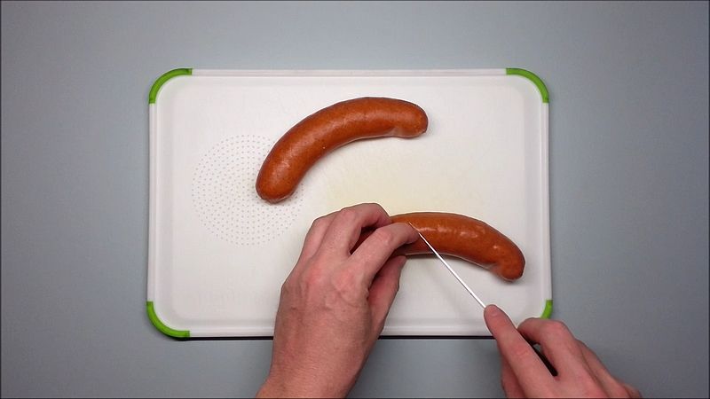 Klobásy na povrchu nařízneme nožem (jinak při pečení prasknou) a tím vytvoří se po upečení krásná mřížka.