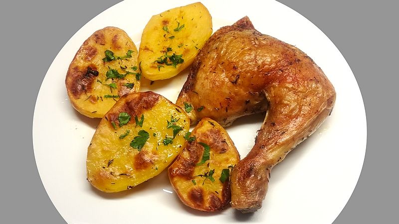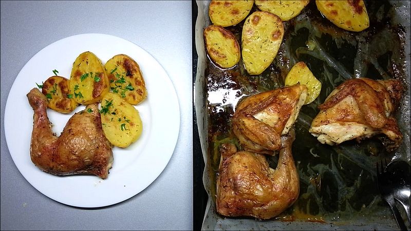 Pečeme v předehřáté troubě na 180 stupňů asi 60 minut. Poté kuře potřeme výpekem a pečeme ještě asi 30 minut (podle velikosti kuřete). Na talíři brambory ozdobíme nakrájenou petrželkou.