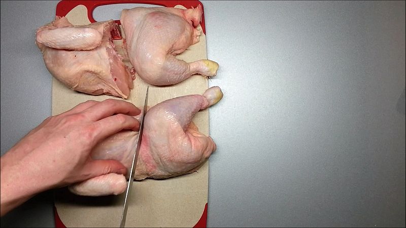 Nejdříve kuře naporcujeme na čtvrtky popřípadě zbavíme vnitřností pokud je ještě má.