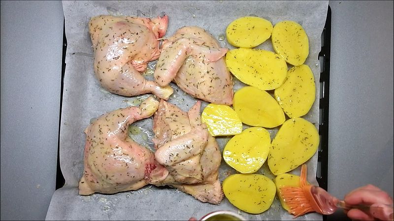 Kuře potřeme směsí z 80 g rozpuštěného másla + 1/2 lžičky sušeného tymiánu + 1/2 lžičky soli ze všech stran a brambory také. Obojí dáme na plech do trouby na pečící papír.