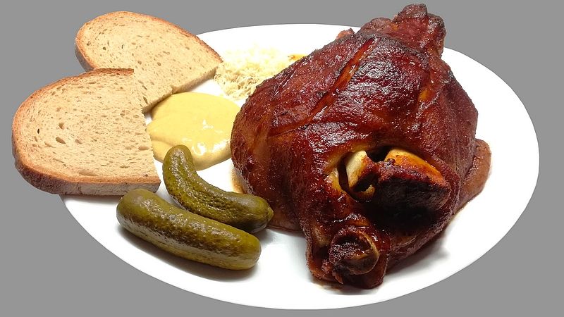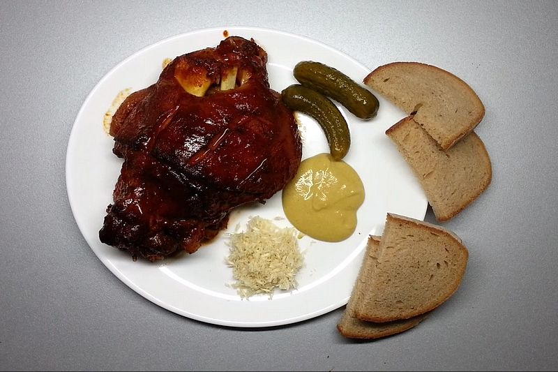 Jako příloha k pečenému kolenu je hořčice, strouhaný křen, kyselé okurky a chleba.