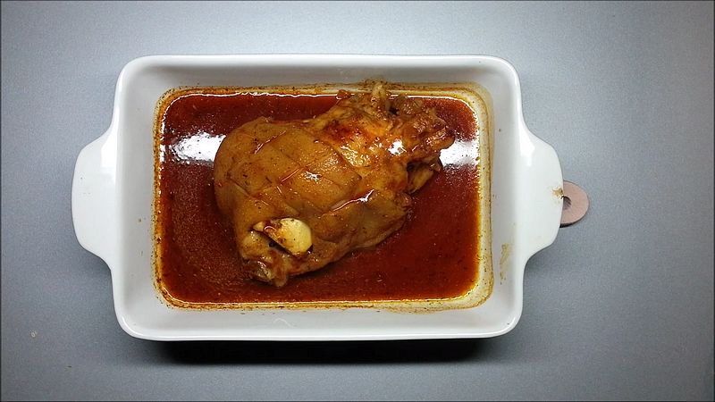 Vařené koleno přendáme do pekáčku a nařízneme kůži do kříže. Přelijeme marinádou a pečeme v předehřáté troubě na 180 stupňů cca 1 hodinu a během pečení několikrát poléváme marinádou z pekáčku.
