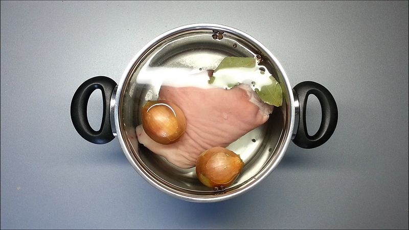 Vepřové koleno dáme do hrnce, přidáme 2 bobkové listy, 6 kuliček nového koření, 10 kuliček celého pepře, 1 rozkrojenou cibuli, 1 lžičku soli a zalijeme vodou aby bylo koleno potopené. Vaříme pod poklicí na mírném varu podle velikosti kolena do měkka což trvá 2 až 3 hodiny. Musí být celou dobu pořád potopené.