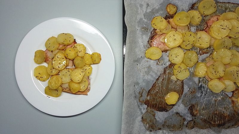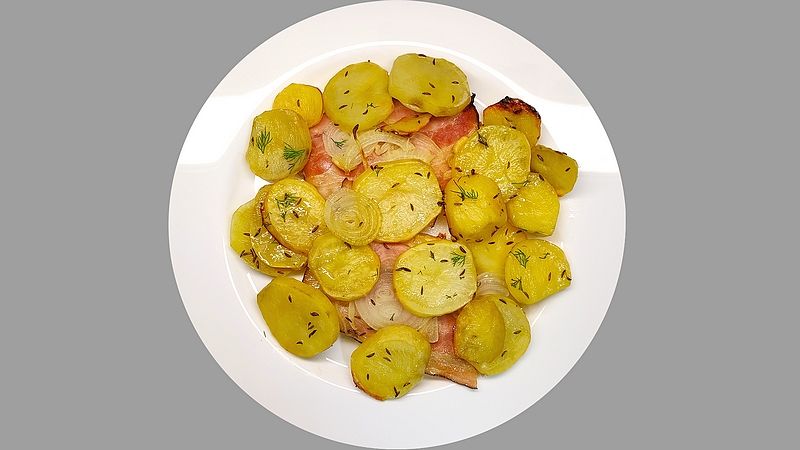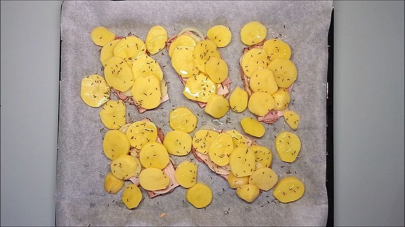 Nakonec přidáme nakrájené brambory na plátky a můžeme je dát i okolo masa. Brambory pokapeme olejem, osolíme a posypeme celým kmínem.