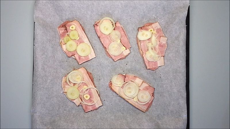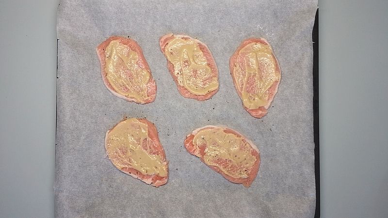 Naklepané plátky vepřové pečeně (silné 1 cm) dáme na pečící papír, osolíme, opepříme a potřeme z horní strany plnotučnou hořčicí.