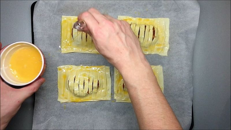 Poté přidáme vrchní nařezané části listového těsta a ty také z horní strany potřeme vajíčkem.