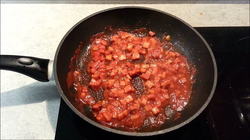 150 g anglické slaniny nakrájíme na kostičky a osmažíme na oleji. Poté přidáme 2 stroužky prolisovaného česneku, 100 g rajčatového pyré, 1 lžičku cukru krystal a 1 lžíci sójové omáčky. Pozvolna vaříme dokud směs nezhoustne, celkem asi 5 minut.
