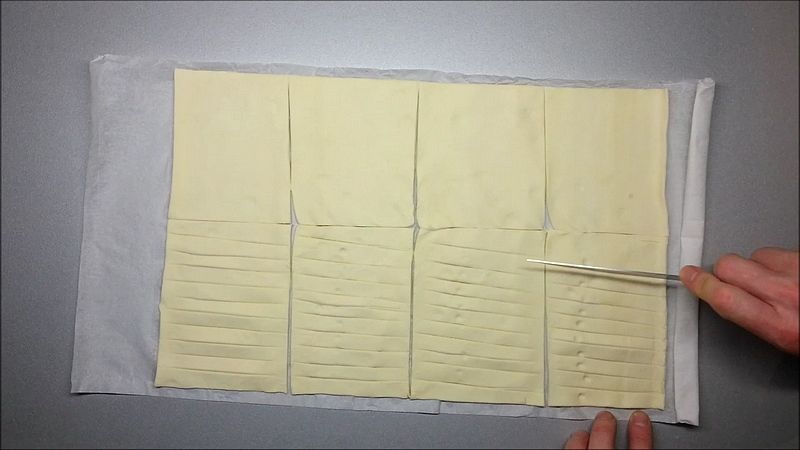 Listové těsto rozdělíme na 8 dílů a do 4 z nich uděláme zářezy – to budou vrchní části.