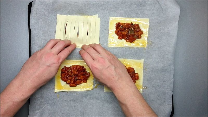 Nenařezané části listového těsta přendáme na pečící papír. Na ně dáme vychladlou směs, posypeme sušeným kořením oregano a okolo potřeme vajíčkem.