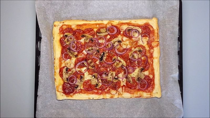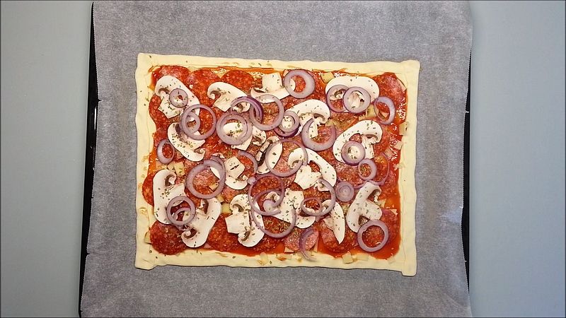 Přidáme nakrájený tvrdý sýr, salám nebo šunku či klobásu, žampiony, červenou cibuli a vše posypeme sušeným oreganem.
