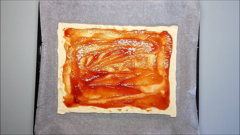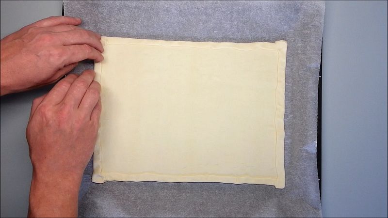 Listové těsto přendáme na pečící papír na plech do trouby, přehneme okraje a přimáčkneme.