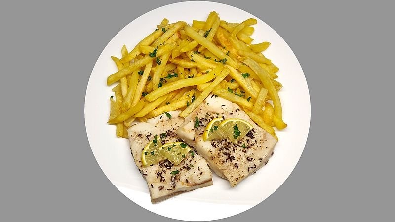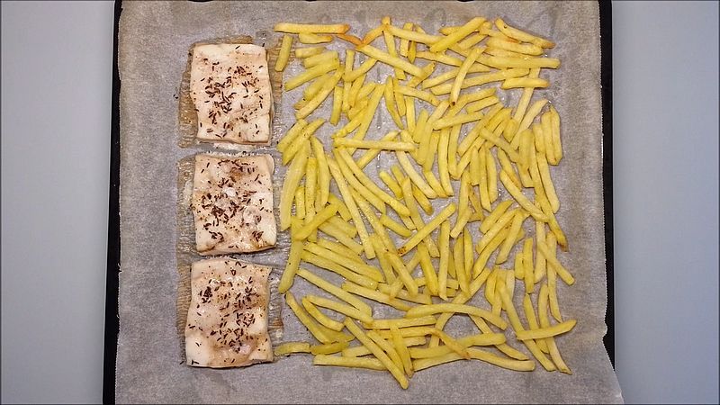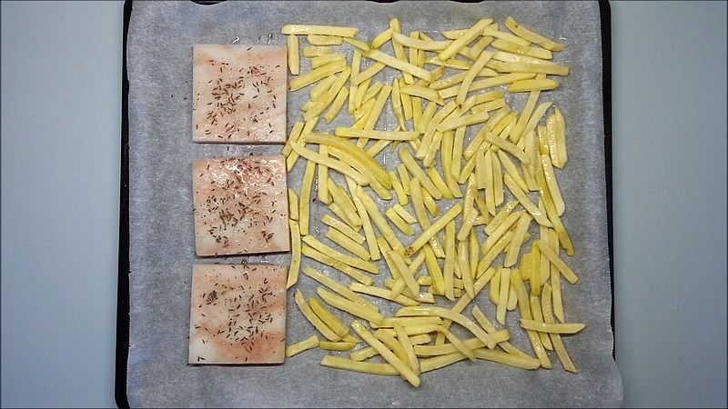 Mražené rybí filé dáme na pečící papír na plech. Okolo přidáme mražené hranolky.