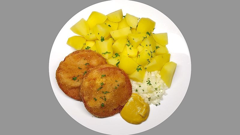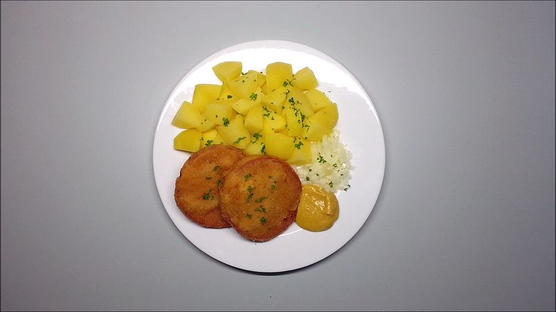 Podáváme společně smažený gothaj, vařené brambory, cibuli a hořčici.