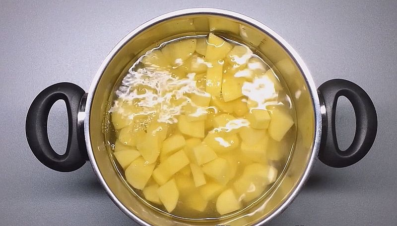 Oškrábané brambory nakrájíme na větší kostičky, zalijeme vodou, přidáme sůl a vaříme do měkka.