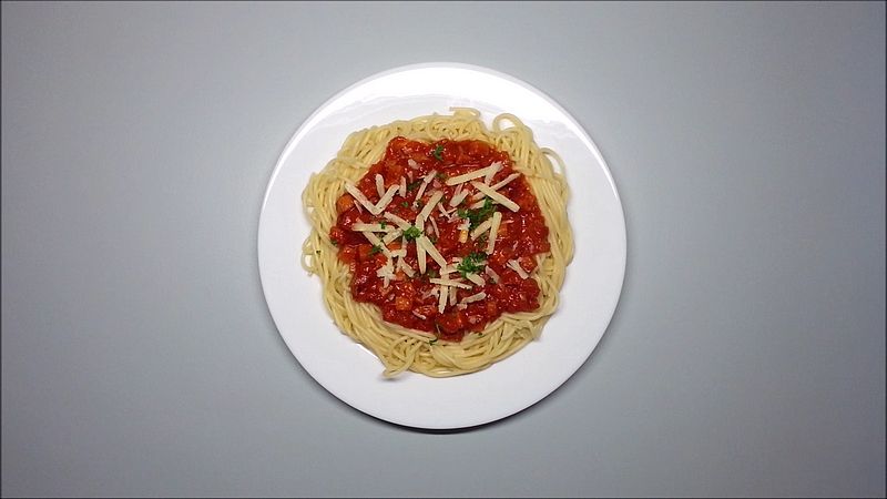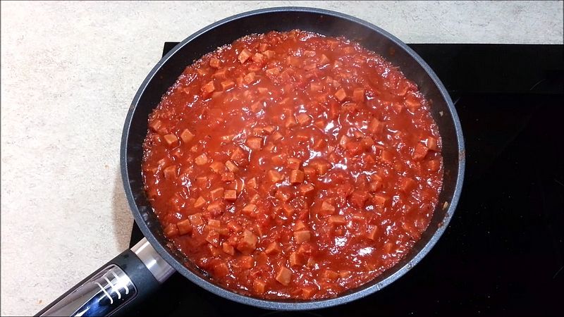 Poté přidáme 2 prolisované stroužky česneku, mletý pepř, 1/2 lžičky sušeného oregana, 1/2 lžičky sušené bazalky, 1 lžičku plnotučné hořčice, 2 lžíce sójové omáčky, 800 g loupaných krájených rajčat v plechovce (2× plechovka 400 g), 4 lžičky cukru krystal, 1 lžičku rajčatového protlaku (nemusí být), a vaříme 20 minut. Směs krásně zhoustne. Nakonec popřípadě dosolíme.