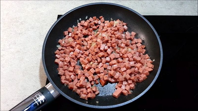 Přidáme 350 g nakrájeného gothaje na kostičky a 1 minutu smažíme.