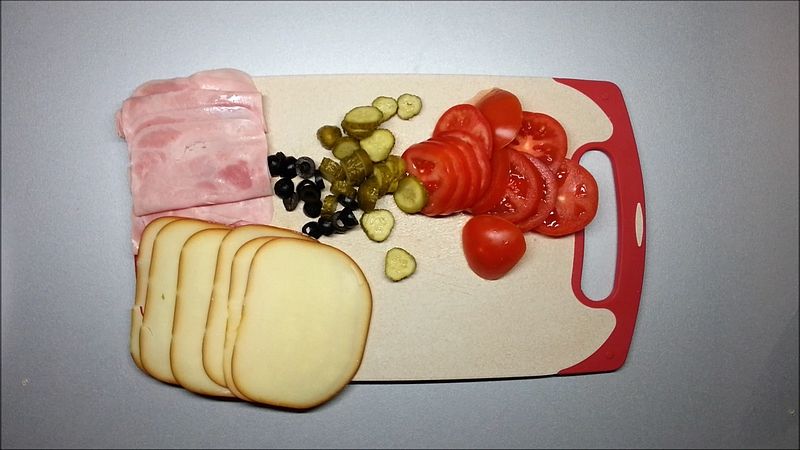 2 rajčata, 2 kyselé okurky a 4 černé olivy nakrájíme na plátky. Připravíme si plátkový sýr a šunku.